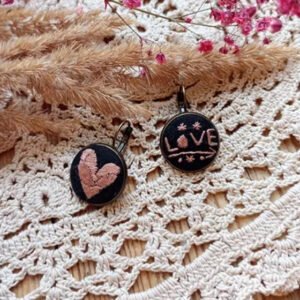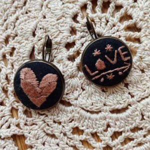 Unikatowa para kolczyków ręcznie haftowanych muliną w odcieniu pudrowego różu na czarnym tle. Jeden kolczyk z napisem „LOVE” ozdobionym drobnymi kwiatkami, drugi z geometrycznym sercem. Delikatne, romantyczne wzory osadzone w metalowej oprawie w kolorze brązu. Bigle zamykane zapewniają wygodę i bezpieczeństwo noszenia.