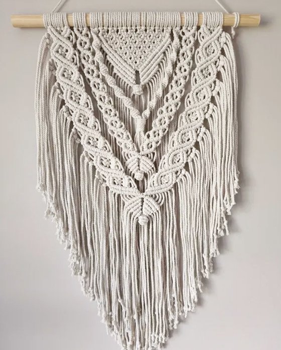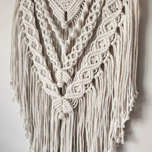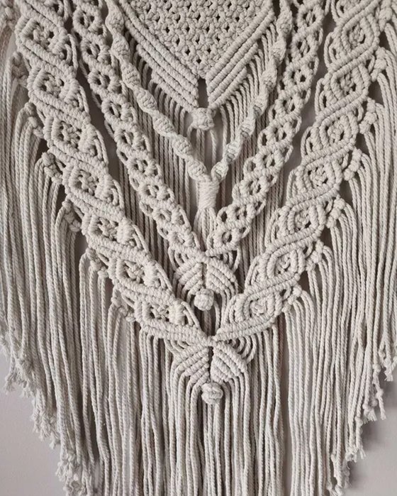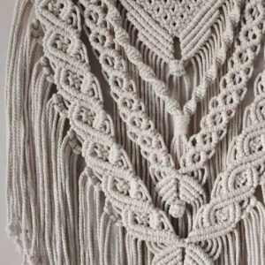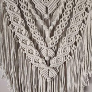 Efektowna makrama ścienna z rozbudowanym wzorem ażurowym w kształcie litery V. Ręcznie pleciona z kremowego sznurka bawełnianego, zawieszona na naturalnym drewnianym drążku. Bogaty, wielowarstwowy splot z dekoracyjnymi supłami i długimi frędzlami wykończonymi w kształt V. Przyciągająca wzrok dekoracja w stylu boho i skandynawskim.