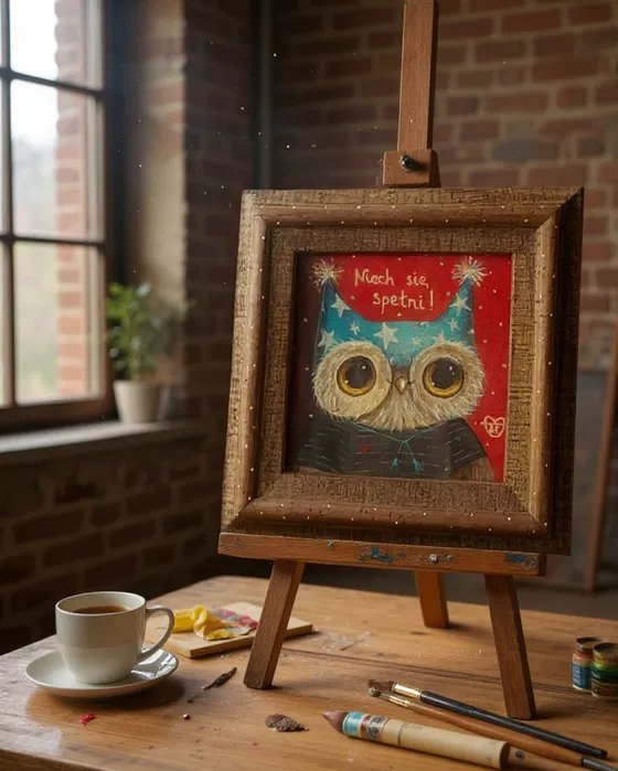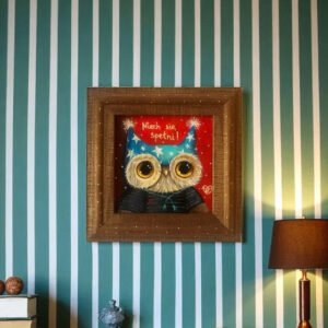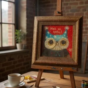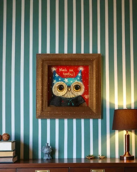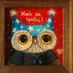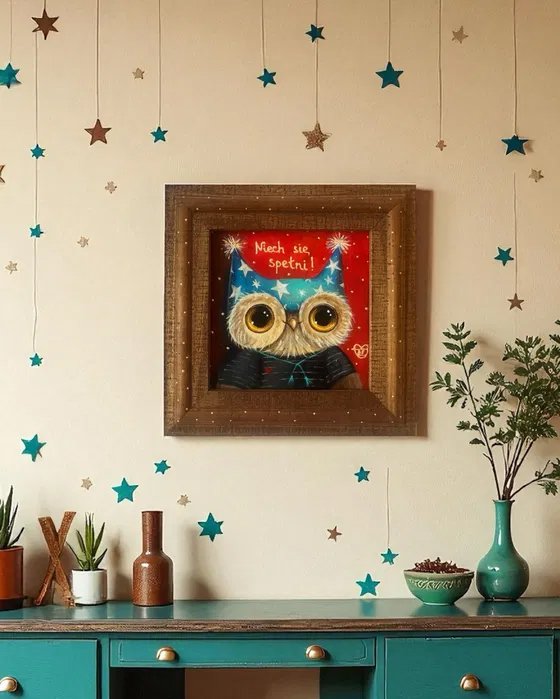 Urocza sowa w magicznej czapce z gwiazdami i napisem „Niech się spełni!” — autorski obraz pełen pozytywnej energii i życzeń. Ręcznie malowany akrylem, sygnowany przez artystkę Mari Kolorową. Ciepła kolorystyka czerwieni i turkusu w klimacie bajkowym. Oprawiony w naturalną drewnianą ramę zdobioną delikatnymi kropkami.