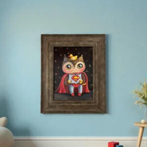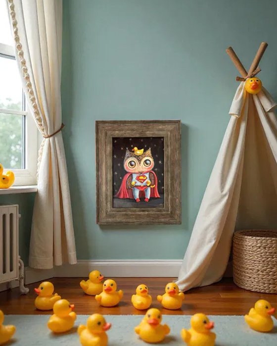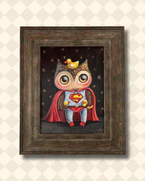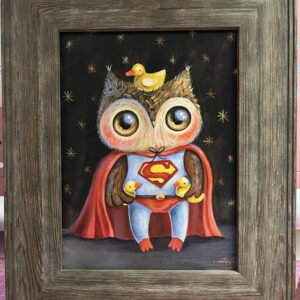 Sowa w pelerynie superbohatera z żółtymi kaczuszkami — autorski obraz łączący humor z ciepłem. Ręcznie malowany akrylem na tablicy malarskiej, sygnowany przez artystkę Mari Kolorową. Tło w głębokiej czerni z drobnymi gwiazdkami podkreśla bajkowy charakter postaci. Oprawiony w rustykalną drewnianą ramę w odcieniu postarzanego drewna.