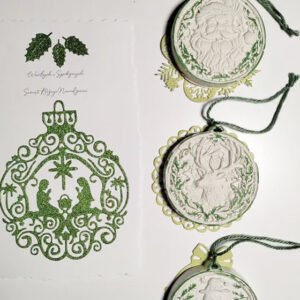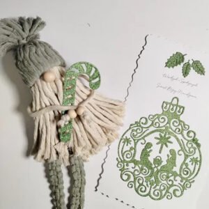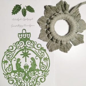 Kompletny zestaw świątecznych dekoracji handmade w harmonijnej kolorystyce szałwiowej zieleni i naturalnego beżu. Każdy element ręcznie wykonany z dbałością o detale — od plecionych makram po gipsowe medaliony z reliefowymi wzorami. Zestaw wprowadzi do wnętrza ciepły, skandynawski klimat świąt. Idealny do własnego domu lub jako gotowy prezent.